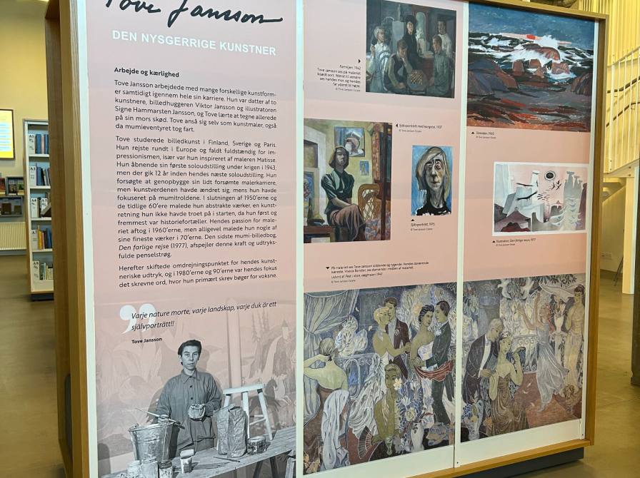 I foråret 2025 har vi på biblioteket markeret Tove Janssons jubilæum med en udstilling om hendes liv og forfatterskab. Her kunne man opleve en ny side af den verdenskendte forfatter – ikke kun som skaber af Mumitroldene, men også som billedkunstner og forfatter til stemningsfulde romaner og noveller for voksne.